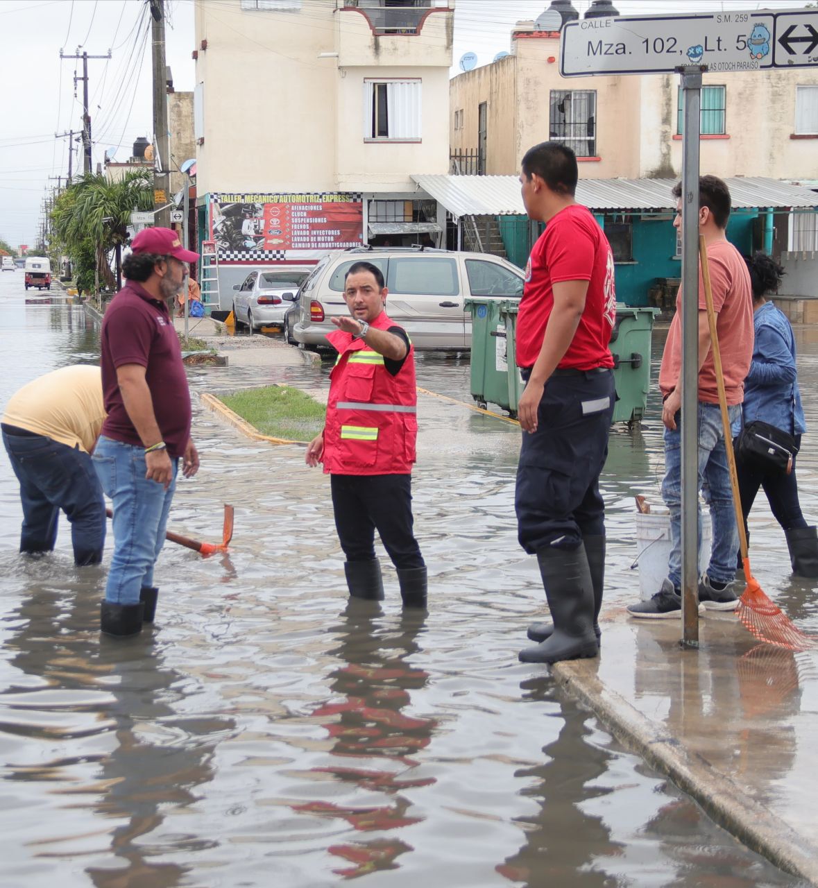 Acompañado por el secretario general del Ayuntamiento, Antonio Riveroll Ribbon; el encargado de despacho de Protección Civil, Johan Alejandro Hendricks Interian; y el director de Bomberos, Aquileo Cervantes Álvarez; se trasladó al fraccionamiento Villas Otoch Paraíso, ubicado en la Supermanzana 259, donde platicó con vecinos de varias arterias como el cruce entre Leona Vicario con avenida Tulipanes y en la calle Orquídeas, e instruyó el retiro de basura de los pozos de absorción y el desahogue del agua de lluvia con ayuda de una bomba de achique, respectivamente.