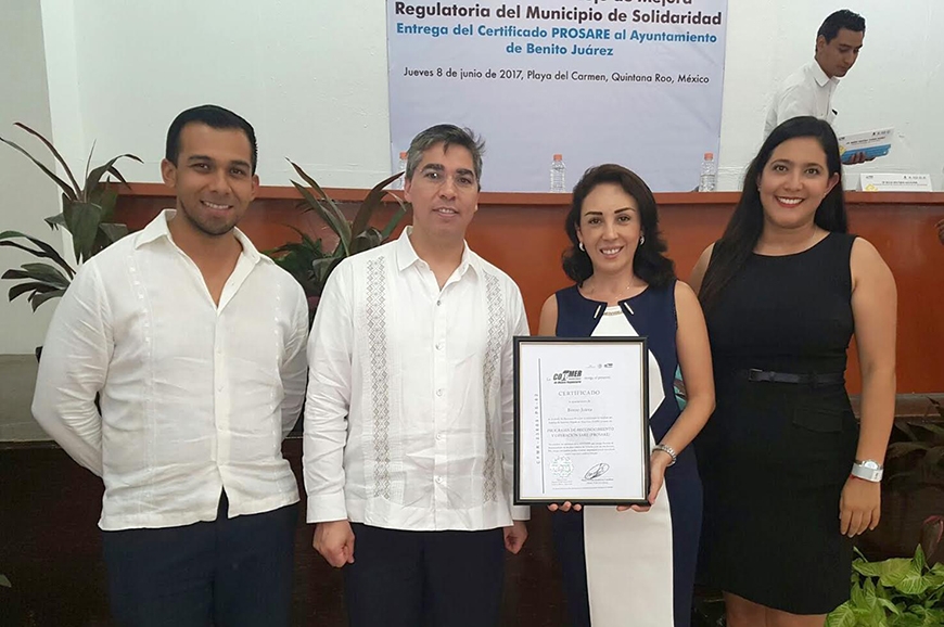 En representación del Presidente Municipal de Benito Juárez, Remberto Estrada Barba, la directora del Instituto Municipal de Desarrollo Administrativo e Innovación (IMDAI), Érika Rendón Soto, recibió la certificación del Programa de Reconocimiento y Operación SARE (PROSARE), por parte de la Comisión Federal de Mejora Regulatoria (COFEMER), lo que lo convierte en el primer municipio en contar con dicho distintivo en la materia.
