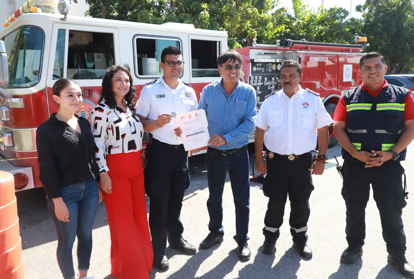 En representación de la Presidenta Municipal, Ana Paty Peralta; la directora general de Relaciones Públicas y Asuntos Internacionales, Aurora de los Ángeles Aguilar Rivero, atestiguó la entrega oficial de la acreditación por parte del Presidente Municipal de Cabo San Lucas, Baja California Sur, Óscar Leggs Castro y al comandante de Bomberos del mismo municipio, Juan Carbajal Figueroa, a los elementos Manuel Reynaldo García Díaz y Janner Enrique Lázaro Gonzáles, quienes serán los encargados de avalar los conocimientos de otros bomberos, tanto de Benito Juárez como de otras partes del país.