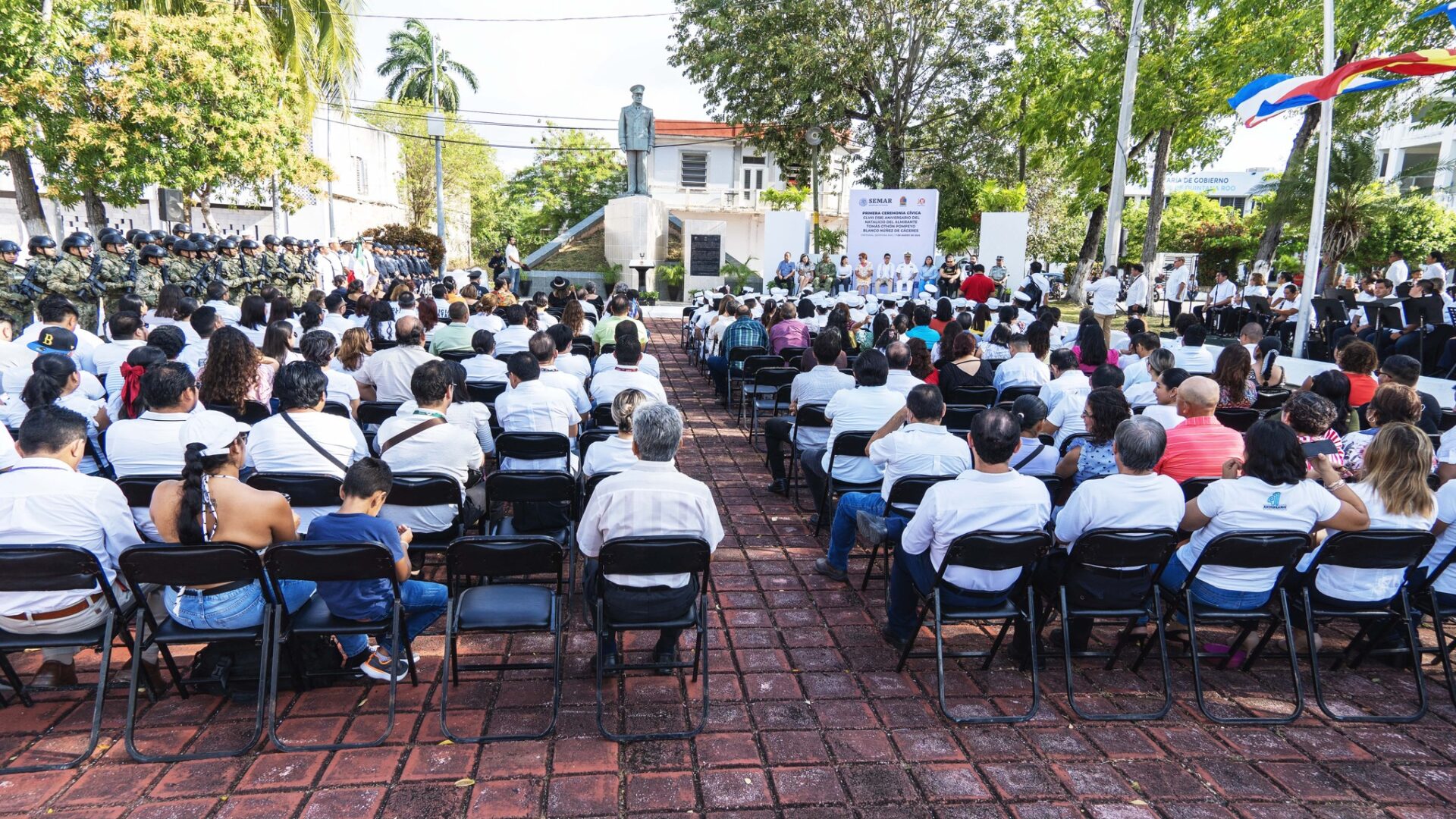 Chetumal, Quintana Roo, 7 de marzo de 2024.- En la historia de Quintana Roo, trasciende el nombre del Almirante Othón Pompeyo Blanco Núñez de Cáceres, fundador de Payo Obispo en el año de 1898, hoy ciudad Chetumal; por tal motivo, la Titular de la Unidad de Vinculación Fiscal y Administrativa, Denisse Bautista Ramos, asistió en representación del Poder Judicial del Estado de Quintana Roo a la ceremonia cívica, con motivo del CLVIII Aniversario del Natalicio del ilustre y diplomático marinero.