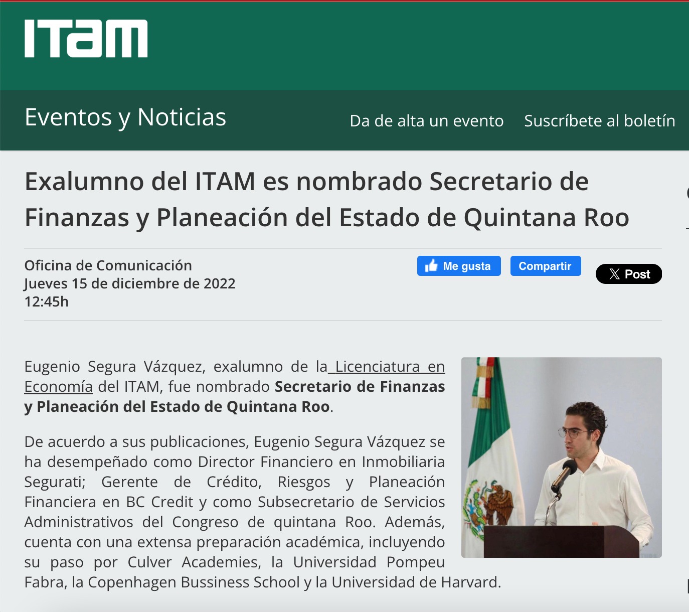 El propio ITAM, publicó los siguiente en su portal oficial, una vez designado Segura Vázquez como titular de Sefiplan, a finales del 2023: