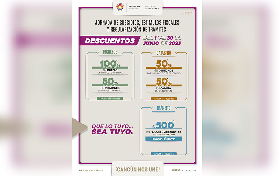 Cancún, Q.R., a 01 de junio de 2023.- Por instrucción de la Presidenta Municipal, Ana Paty Peralta, de continuar con el apoyo a la economía familiar, la Dirección de Ingresos del Ayuntamiento de Benito Juárez, extendió a junio la “Jornada de Subsidios, Estímulos Fiscales y Regularización de Trámites”, para beneficio de contribuyentes y ciudadanos.