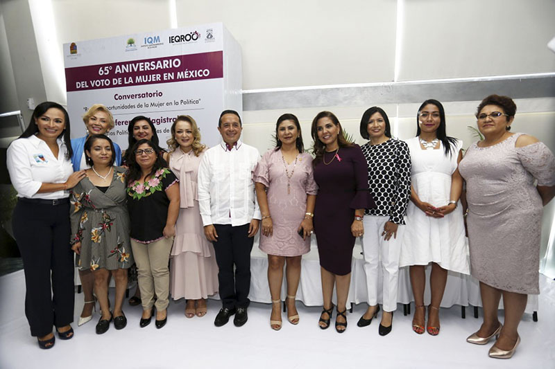 Cancún.- El sufragio femenino es un reconocimiento a la igualdad en la participación política, declaró Mara Lezama, al participar en la Conmemoración del 65 Aniversario del Voto de la Mujer en México, organizado por el Instituto Quintanarroense de la Mujer, el Instituto Electoral de Quintana Roo y el Tribunal Electoral del Estado.