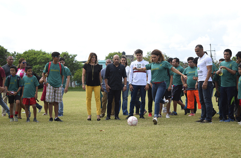 Cancún.- Como parte de las acciones que emprende el Sistema DIF Benito Juárez para fomentar el deporte, como estrategia para el sano esparcimiento y la promoción de la salud, la Presidenta de la Institución, Gloria Torruco de O’Farrill, inauguró el Torneo de Futbol Soccer “De la calle a la vida DIF 2018-2019”, junto con los ex futbolistas brasileños Marcos Evangelista de Morães y José Ailton Da Silva.