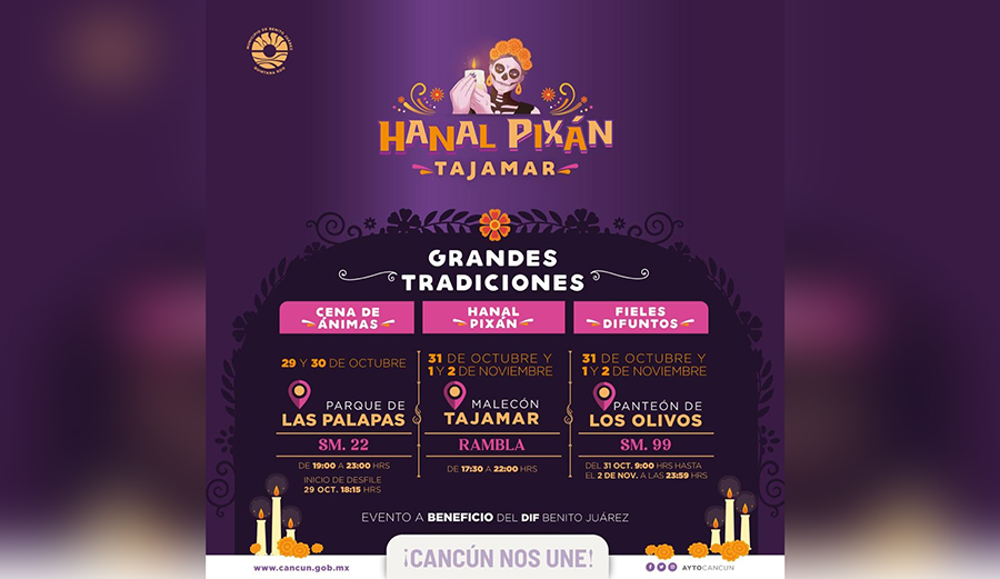 El principal atractivo se llevará a cabo en Malecón Tajamar, con la segunda edición de “Hanal Pixán”, en la cual se espera recibir los días 31 de octubre, así como 1 y 2 de noviembre, a más de 15 mil asistentes, quienes podrán disfrutar de venta de alimentos, bebidas y artesanías; así como de exhibiciones de baile.