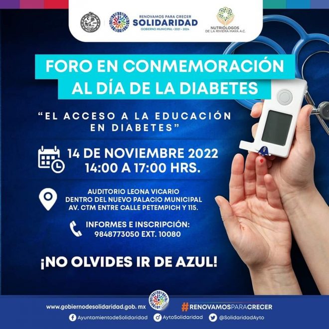 Playa del Carmen, Solidaridad, 10 de noviembre del 2022.- A fin de promover la educación en diabetes, la presidenta Lili Campos invita a participar en las jornadas conmemorativas al Día de la Diabetes, donde se llevará a cabo el “Foro Aprendamos sobre Diabetes” para concientizar sobre el cuidado de la salud y las familias solidarenses gocen de una buena calidad de vida.