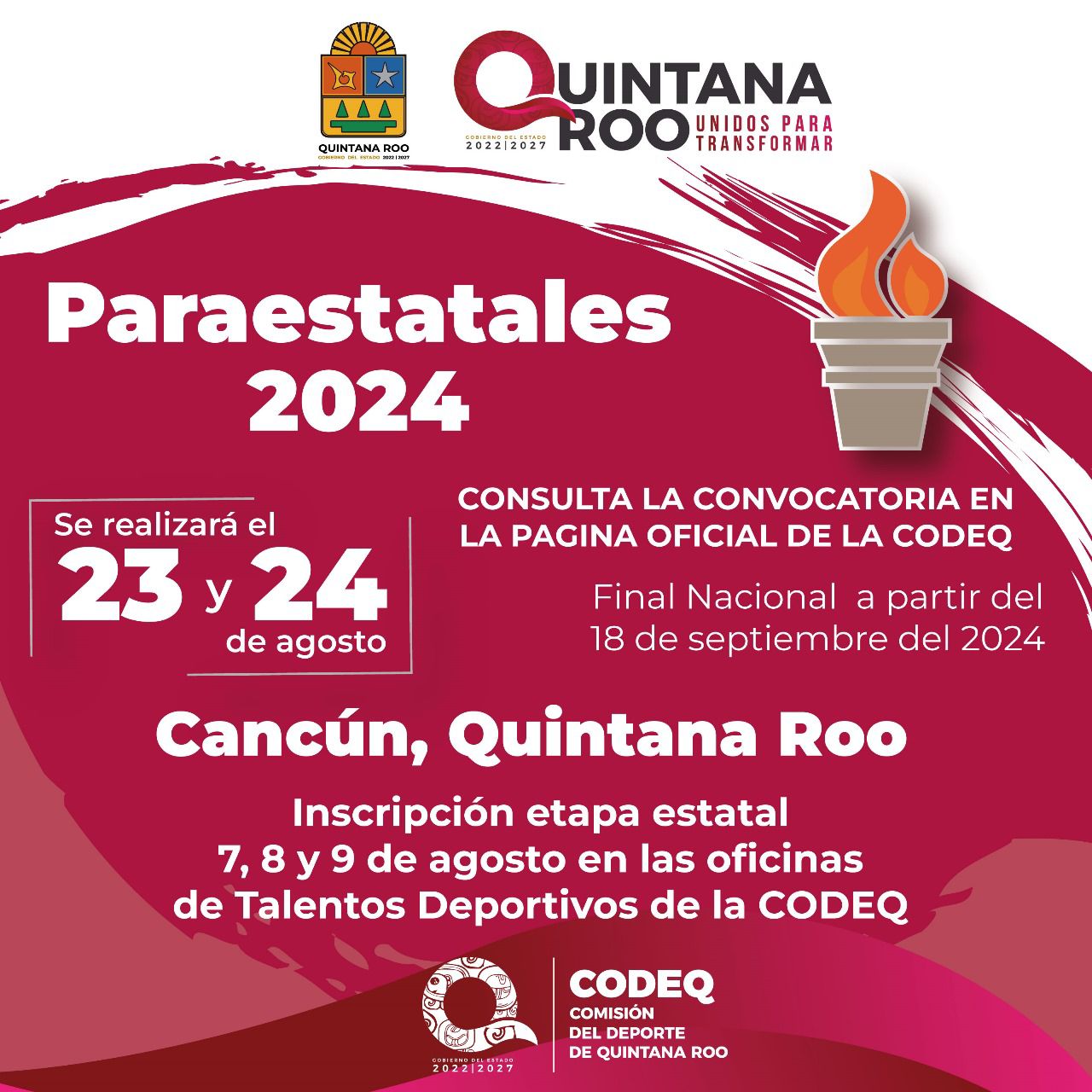También se informó que las inscripciones para esta fase Paraestatal de la justa, se realizará en las oficinas de Talentos Deportivos de la CODEQ en la ciudad de Chetumal, cumpliendo con los requisitos que solicita la convocatoria, la cual se puede descargar vía internet a través del link: https://bit.ly/4bWsi6s.
