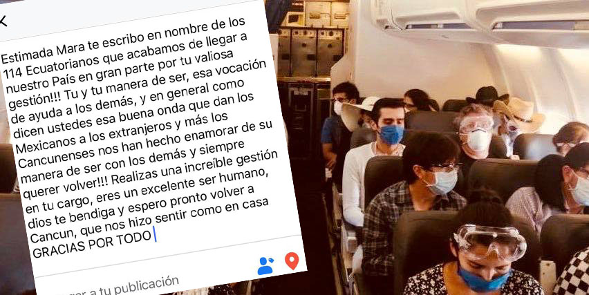 Más de un centenar de ecuatorianos han expresado a la presidente de Benito Juárez, Mara Lezama, su gestión que les permitió regresar a su país de origen, luego de estar varados en el Aeropuerto Internacional de Cancún a consecuencia de los cierres de fronteras decretados por la pandemia del COVID-19.