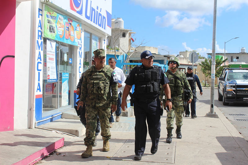 Solidaridad.- Para mantener el orden y ejercer presencia policial en todo el municipio, la Dirección General de Seguridad Pública y Tránsito, en coordinación con la Policía Naval, Policía Militar, Policía Federal y Fuerzas Federales División Gendarmería, realizan patrullajes de vigilancia a pie en colonias y fraccionamientos, con lo cual inciden de manera directa en la prevención del delito.