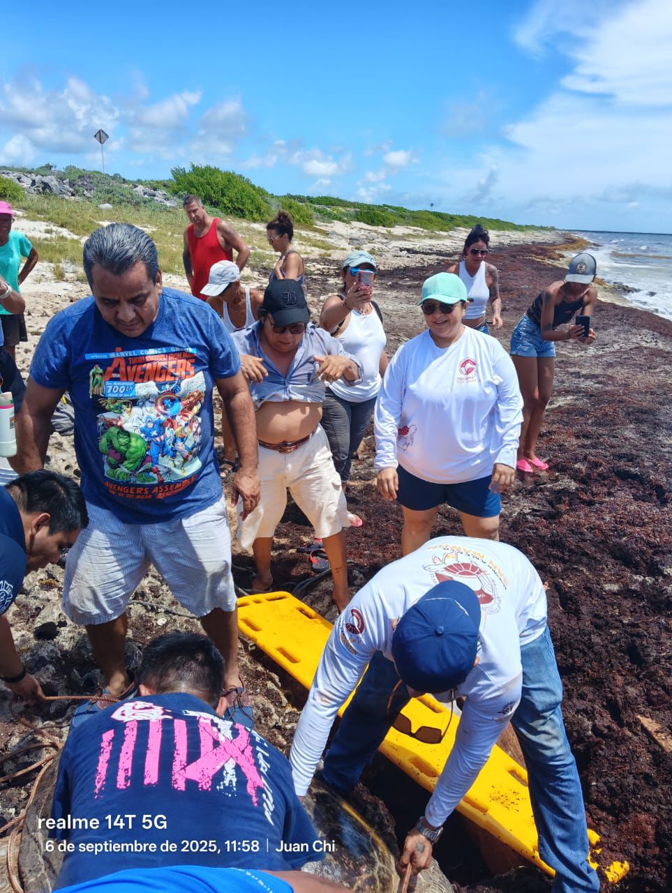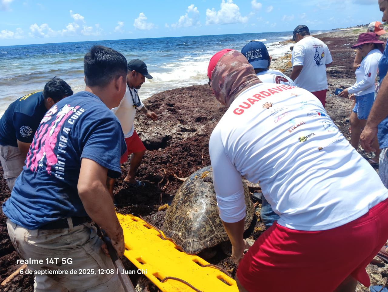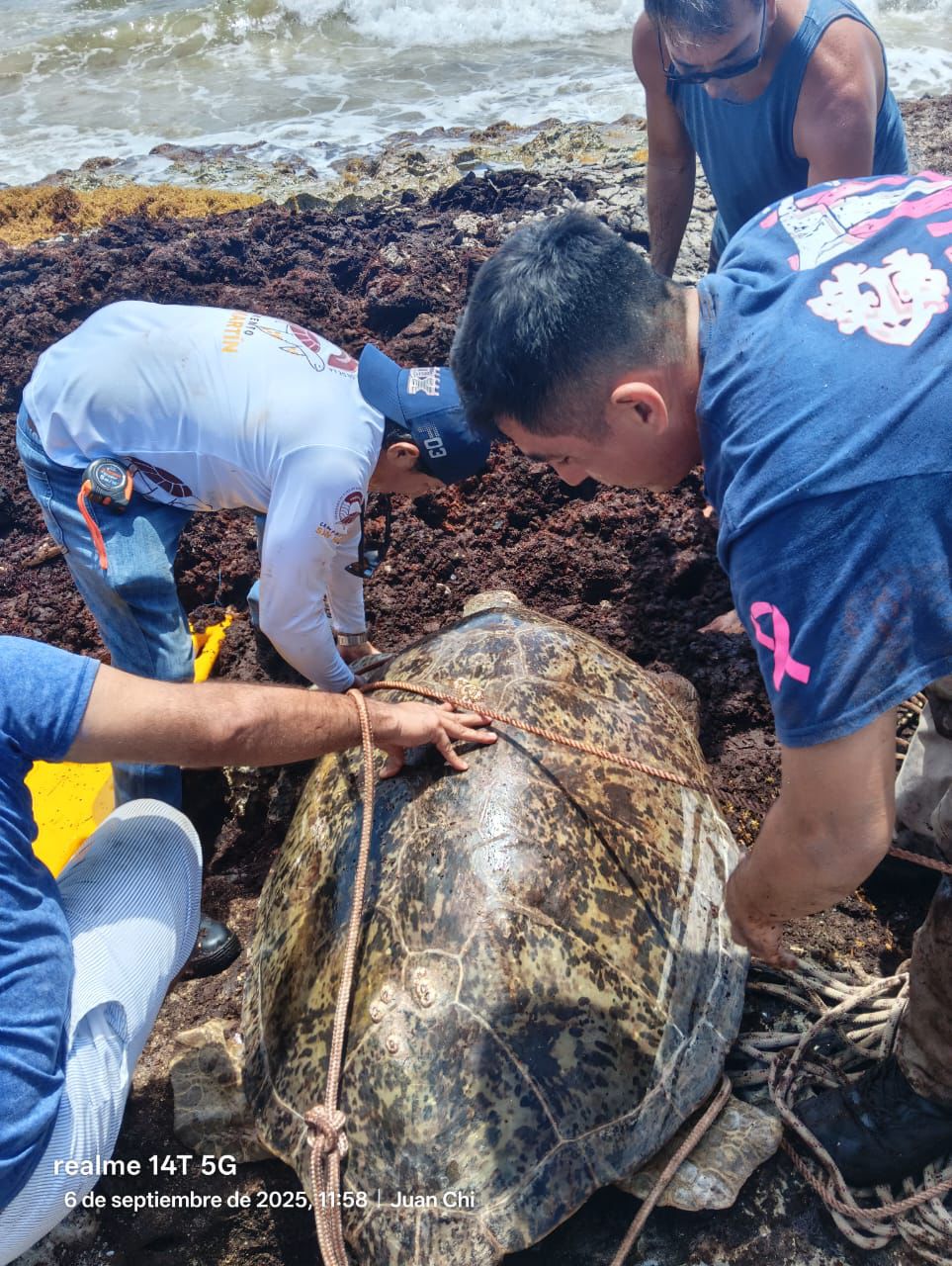 Cozumel, 06 de septiembre del 2025. – En un esfuerzo conjunto y como parte del compromiso con la conservación del medio ambiente, el Gobierno Municipal de Cozumel a través de la Subdirección de Ecología, coordinó el exitoso rescate de una tortuga marina de la especie “Verde” (Chelonia mydas) que se encontraba atrapada entre las rocas en una zona de difícil acceso aproximadamente a un kilómetro antes de llegar a Punta Morena, en el lado oriente de la isla.