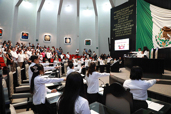 Chetumal, Quintana Roo.- Las diputadas y diputados infantiles que conformaron el Décimo Primer Parlamento Infantil de Quintana Roo, usaron la máxima tribuna del Estado para expresar sus ideas y propuestas en pro de la transformación de nuestra entidad, así como para reflexionar sobre temas de trascendencia para la sociedad como el cambio climático, cuidado del medio ambiente, combate a la corrupción y los derechos de las niñas y los niños, entre otros.