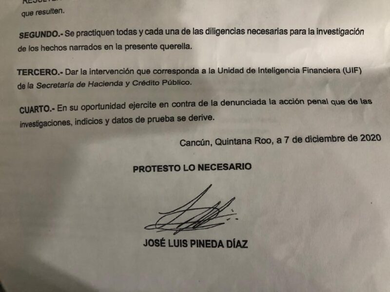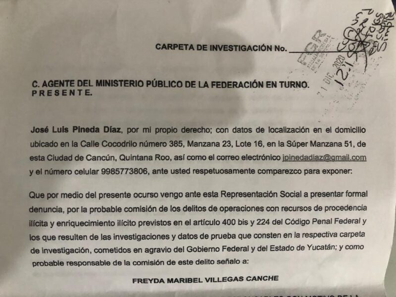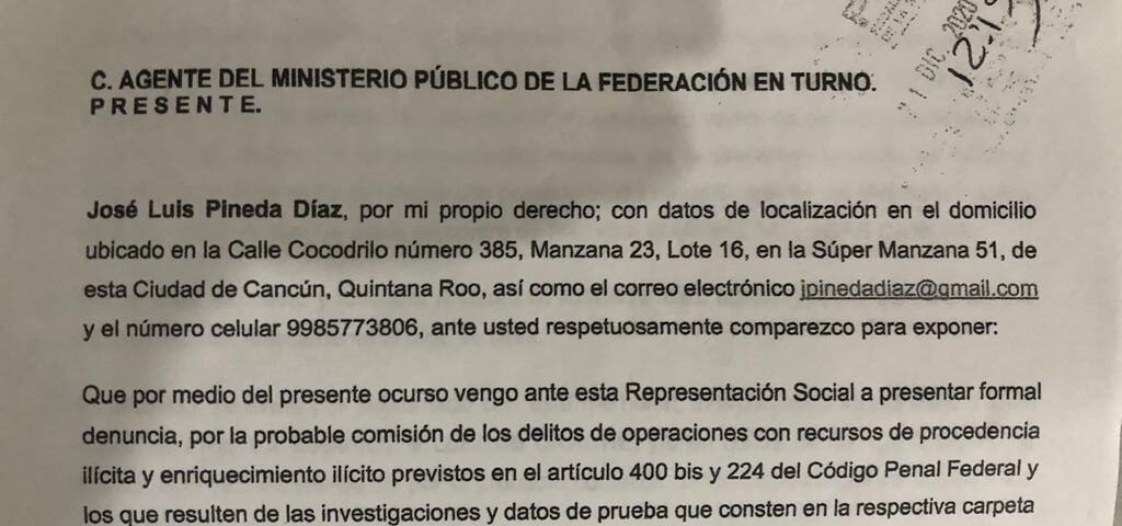 La denuncia fue recibida por la Oficialía de Partes de la FGR en Cancún el pasado siete de diciembre.