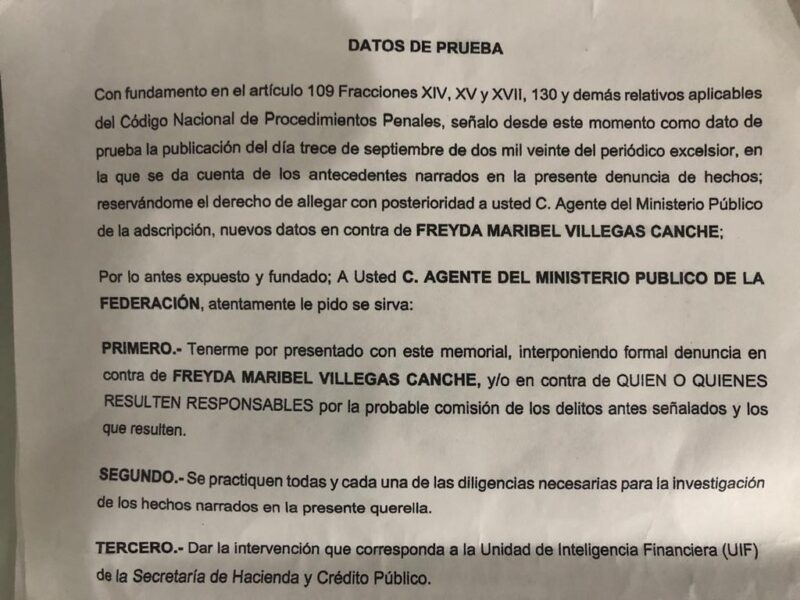 La denuncia indica que Pineda Díaz presentó adjunto una serie de pruebas documentales para la consideración de la FGR.